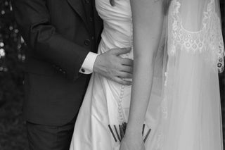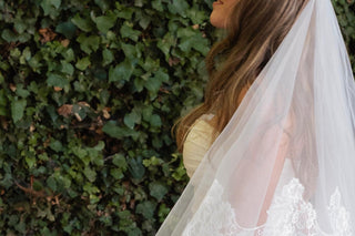 Para Regina Martínez creamos un velo completamente personalizado: una pieza de tres metros, confeccionada en tul italiano de caída impecable. Su encaje, de motivo floral, fue recortado a mano para diseñar un patrón exclusivo únicamente para ella.