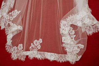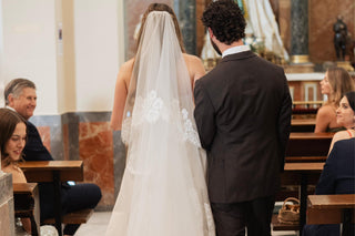 Regina buscaba un velo versátil pero sofisticado, por lo que diseñamos un velo velado: la capa superior, más corta y delicada, caía a la altura de los hombros; mientras que la capa principal —la que ella eligió para entrar a la iglesia— se extendía con elegancia hasta el suelo, enmarcando cada paso.
