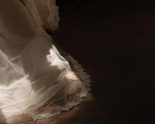 El resultado es un velo que no busca imponerse, sino acompañar, equilibrar y completar. Una pieza que realza la belleza natural de Vania con una sofisticación silenciosa, exacta y atemporal.