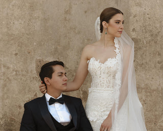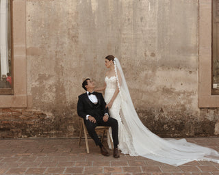 Para Vania Méndez, el punto de partida fue claro: encontrar el encaje ideal que complementara su vestido sin restarle protagonismo. Su velo, de tres metros y de poco volumen, fue diseñado para caer con una suavidad impecable, creando una silueta limpia y ligera.