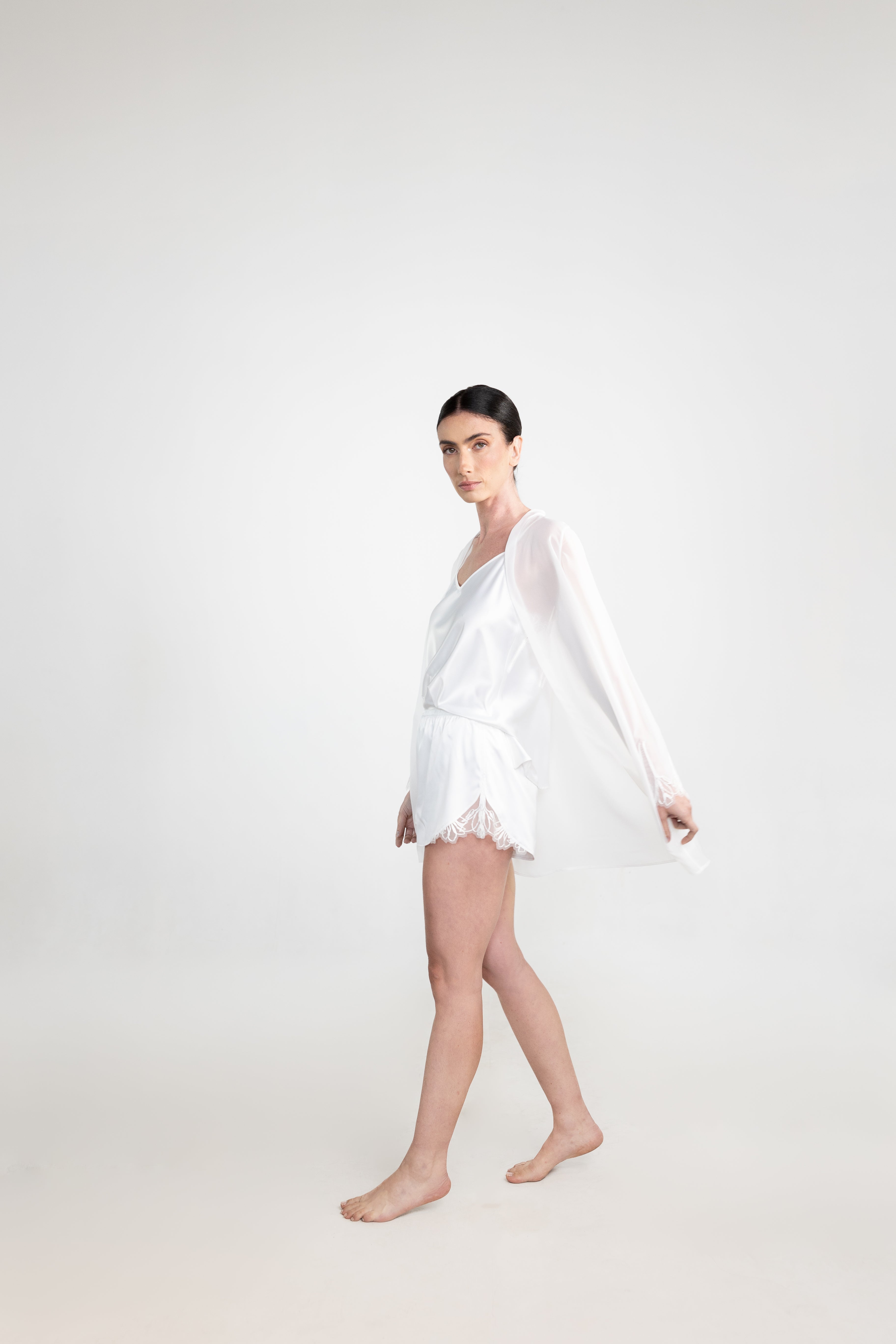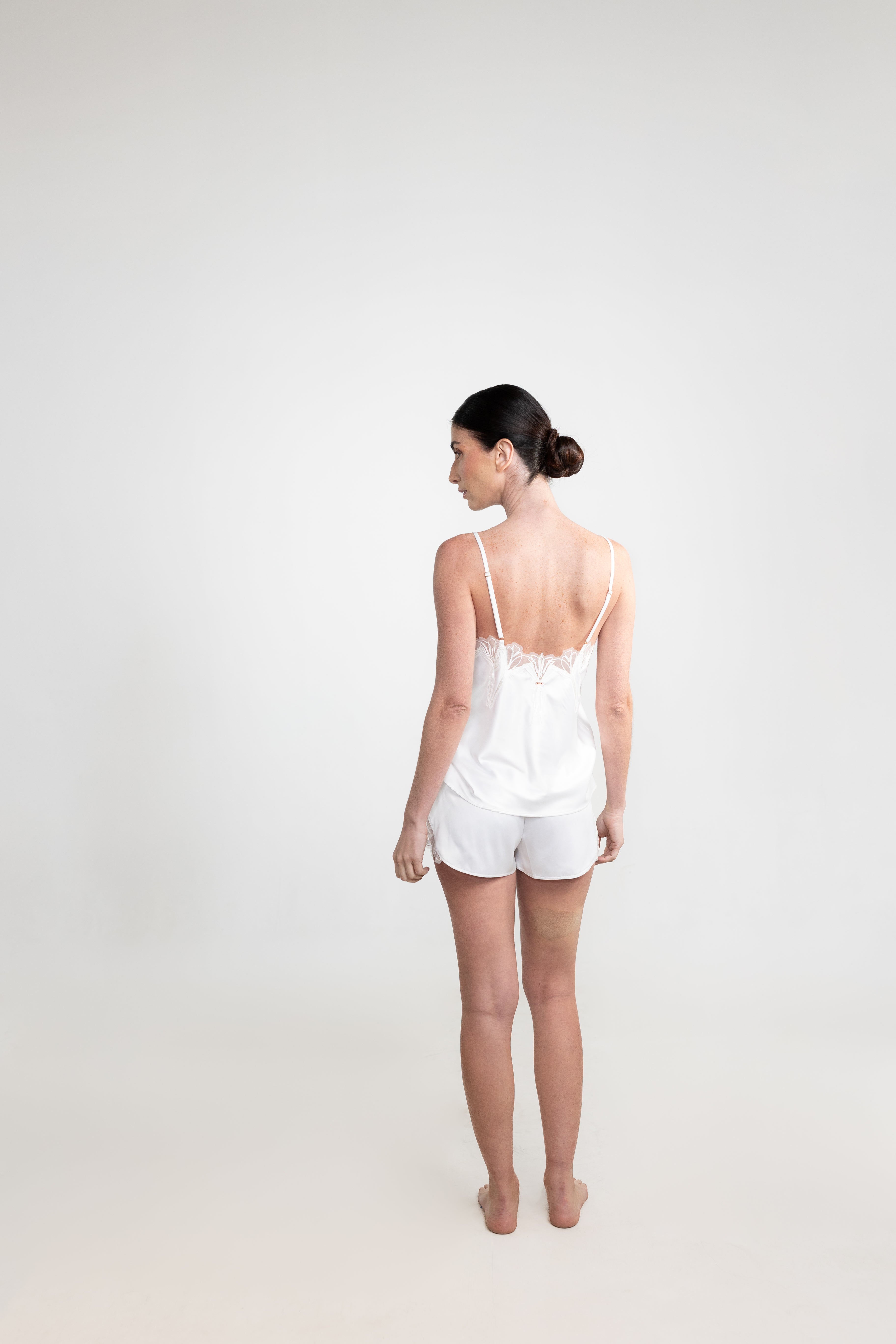 Los "shorts Maree", confeccionados satin con cintura elástica cuentan con un delicado detalle de encaje bordado en el costado. Ideal para combinar con el top "Maree" , un conjunto de pijama elegante y femenino.