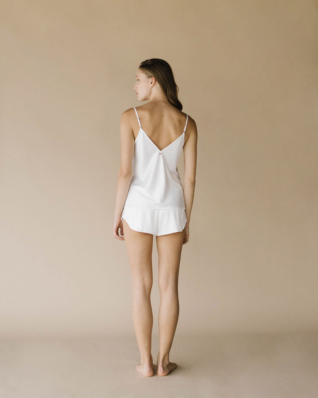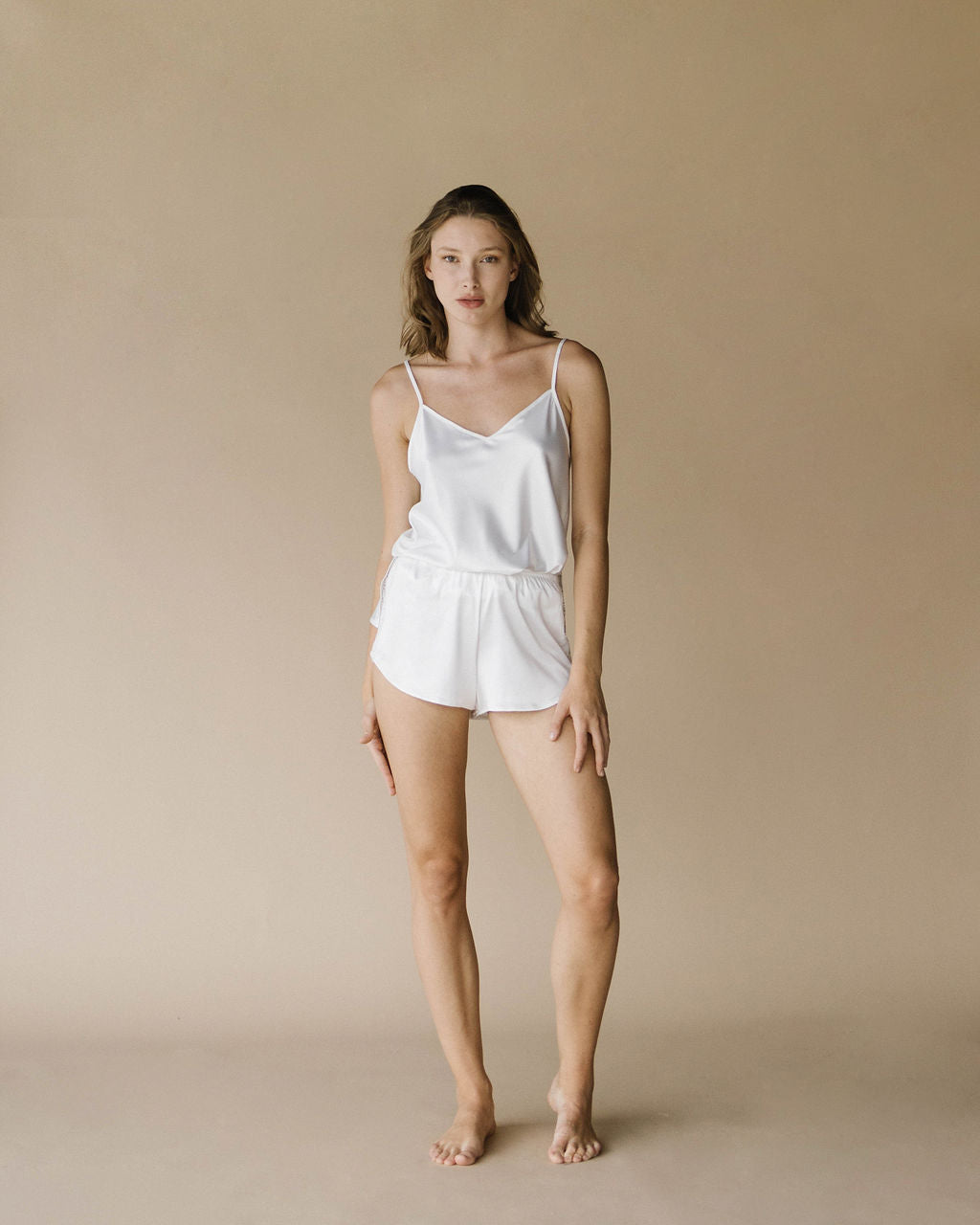 Los shorts 'Soie' - confeccionados en suave satin elástico, ofrecen comodidad con una cintura elástica. Los delicados detalles de encaje Chantilly en los costados añaden un toque de elegancia y transparencia a tu pijama. Combínalos perfectamente con nuestros tops para crear el conjunto perfecto.
