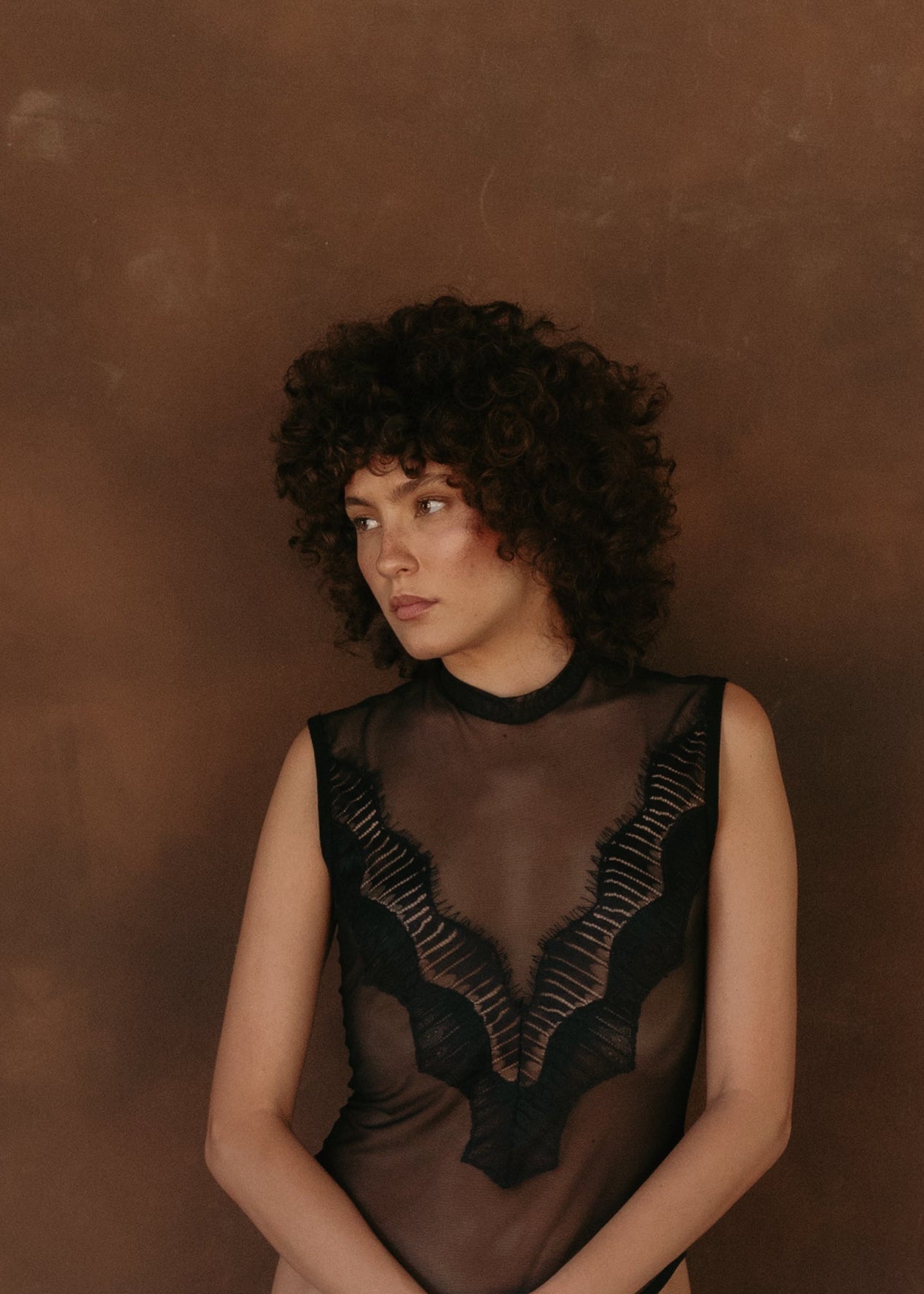 Body confeccionado en mesh con aplicación de encaje en “V” en el escote frontal. Cuenta con ajuste mediante broche en la parte inferior. Una prenda sofisticada que combina transparencia y estructura con un toque femenino.