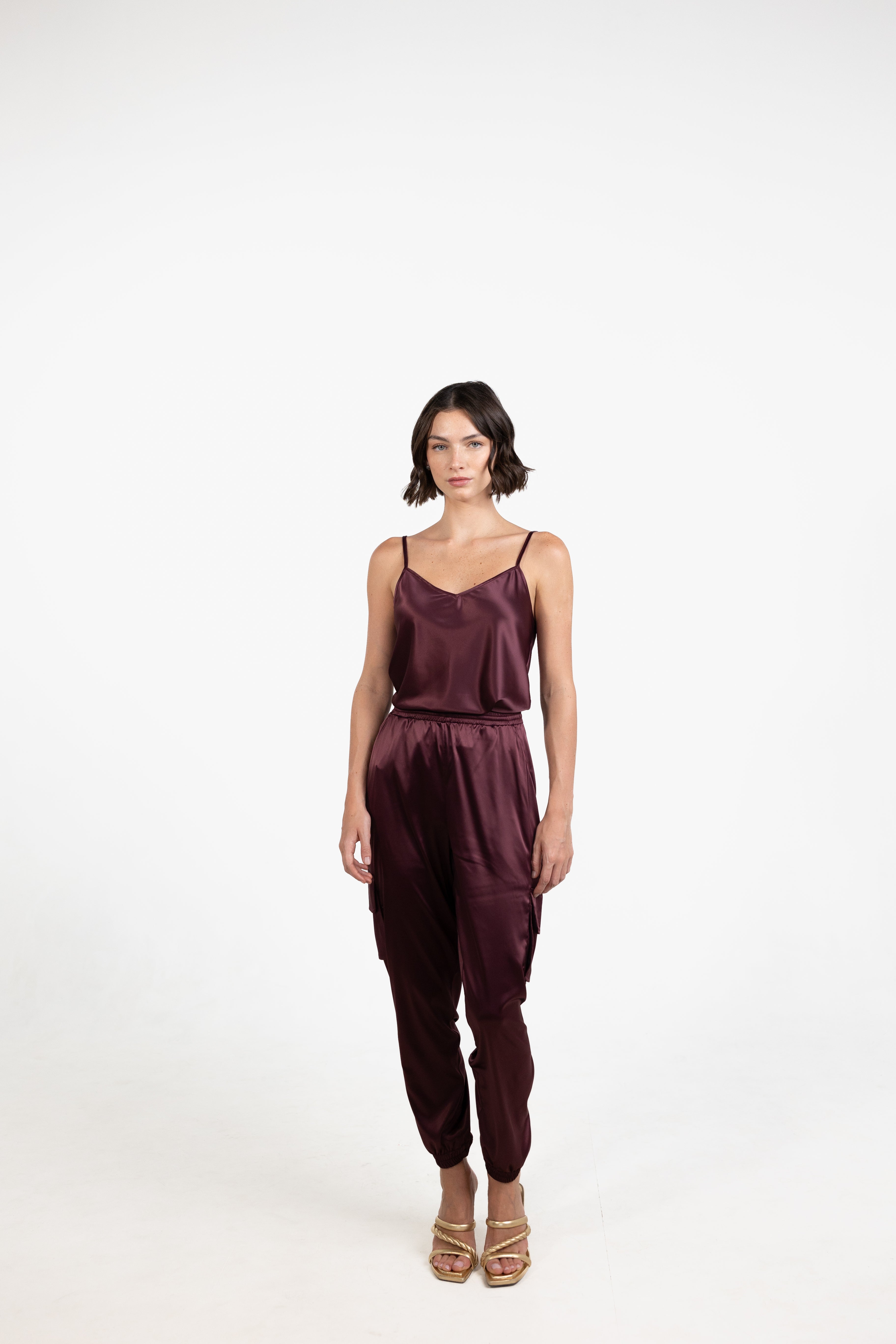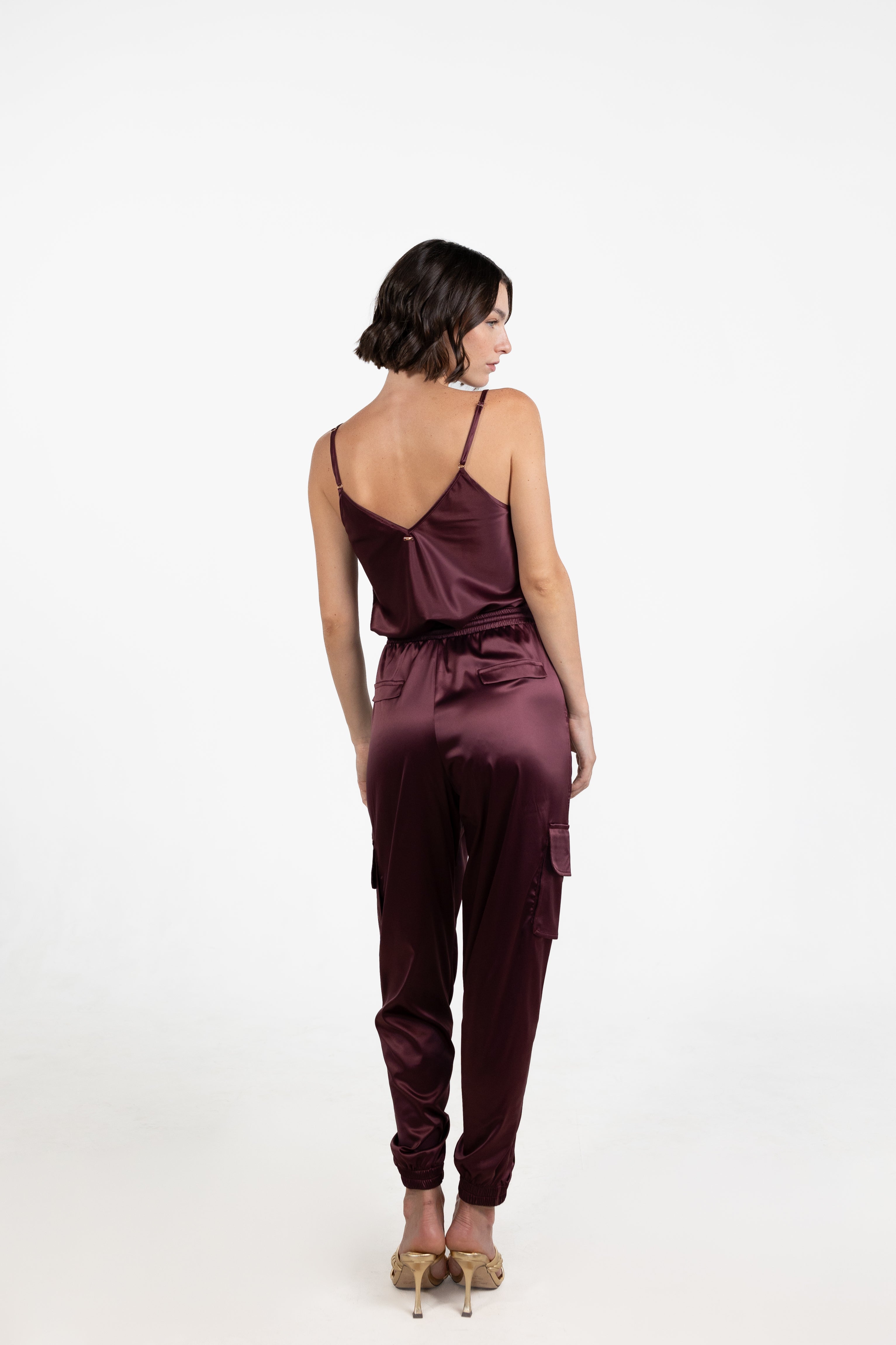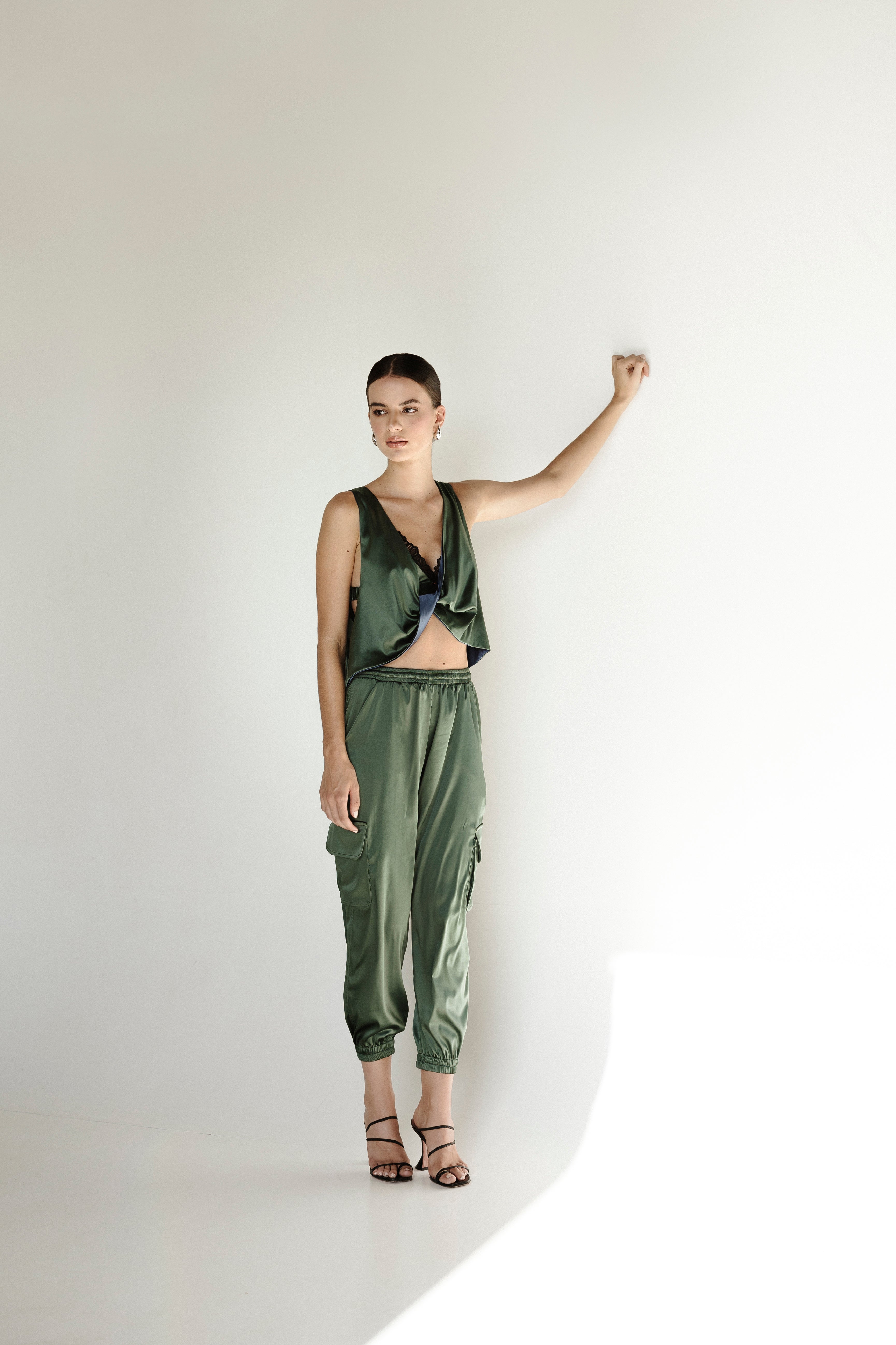 Los cargo pants "Jour" son los pantalones imprescindibles en tu clóset. Confeccionados en satin elástico. Estos pantalones cuentan con bolsillos laterales funcionales, cintura elástica con un cordón ajustable. Se adaptan a tu cuerpo cómodamente y pueden ser utilizados con cualquiera de nuestros tops en ocasiones informales o formales, añadiendo estilo y sofisticación a cualquier look.