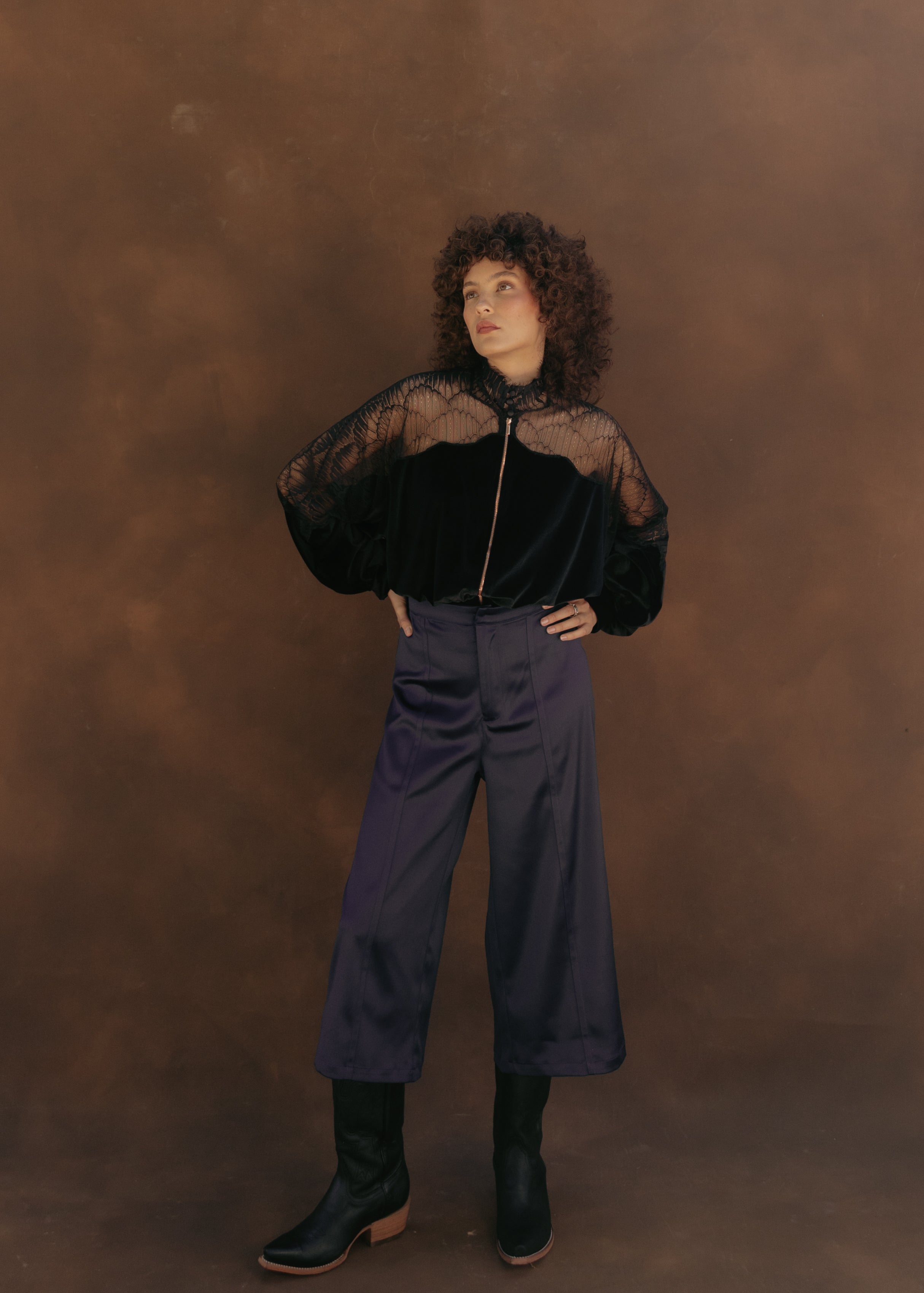 Chamarra tipo jacket confeccionada en terciopelo con aplicaciones de encaje en hombros y brazos. Incluye escote en la espalda, elástico en puños y cintura, y botones en el cuello para un ajuste personalizado. Una prenda estructurada y moderna con un aire romántico.