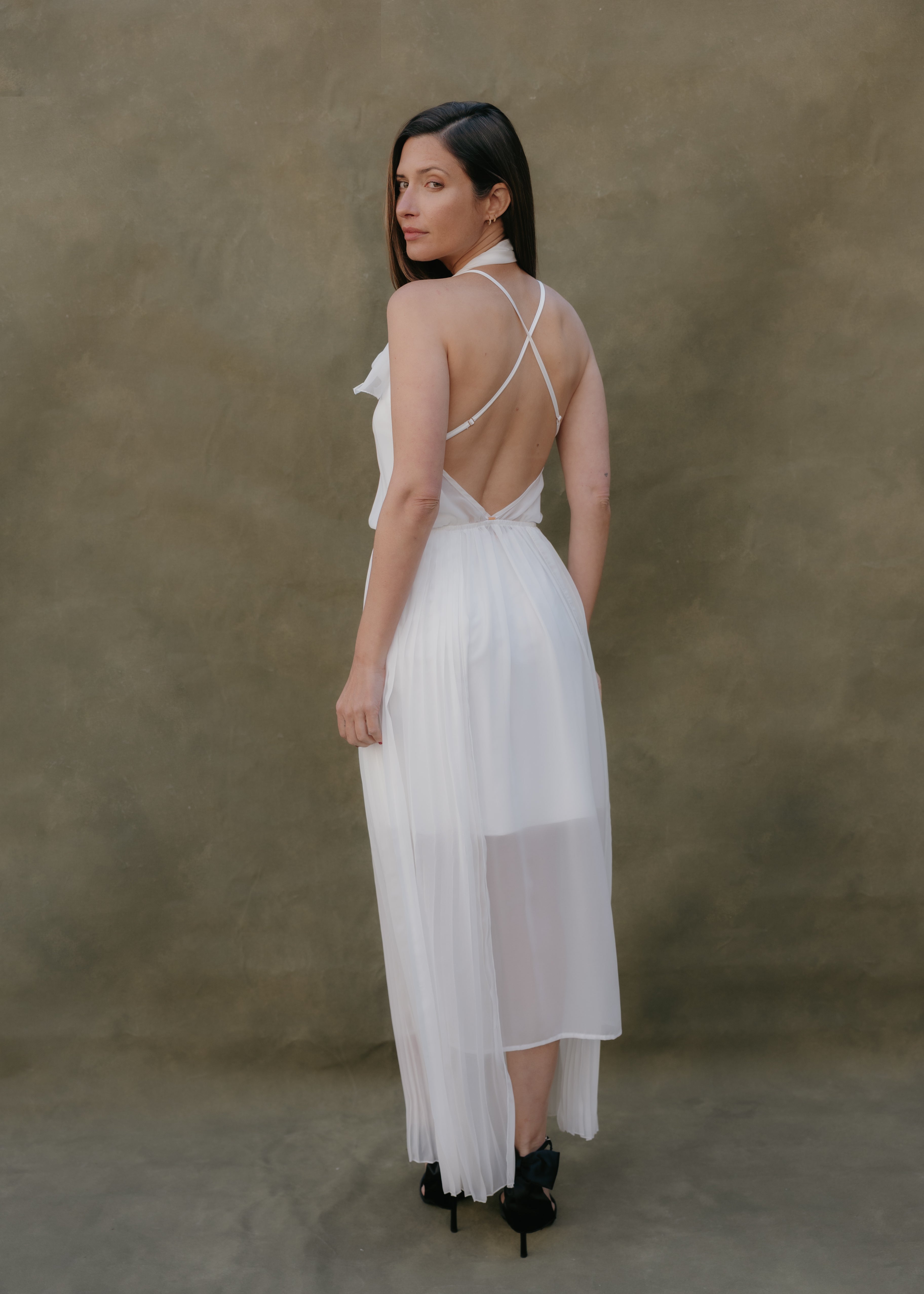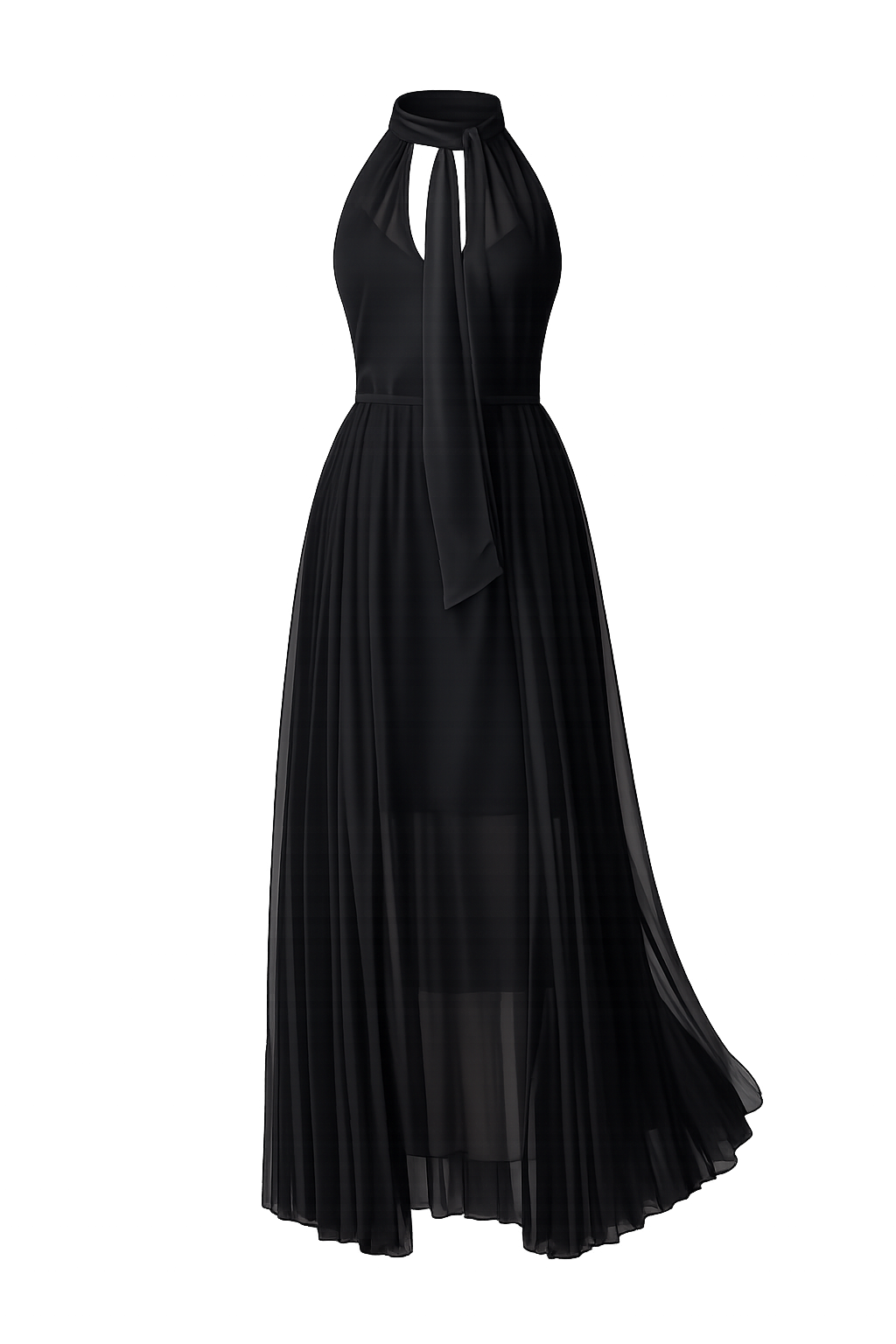 El Vestido Inés en chiffon negro ligero y fluido destaca por su elegancia atemporal y silueta favorecedora. El diseño halter estiliza el cuello y realza la parte superior del cuerpo, acompañado de un escote con transparencia sutil que añade sofisticación. El elástico en la cintura define la figura con comodidad, mientras que el desnivel en la falda y los costados plisados crean movimiento y ligereza. Una pieza femenina y versátil para eventos especiales y ocasiones elegantes.