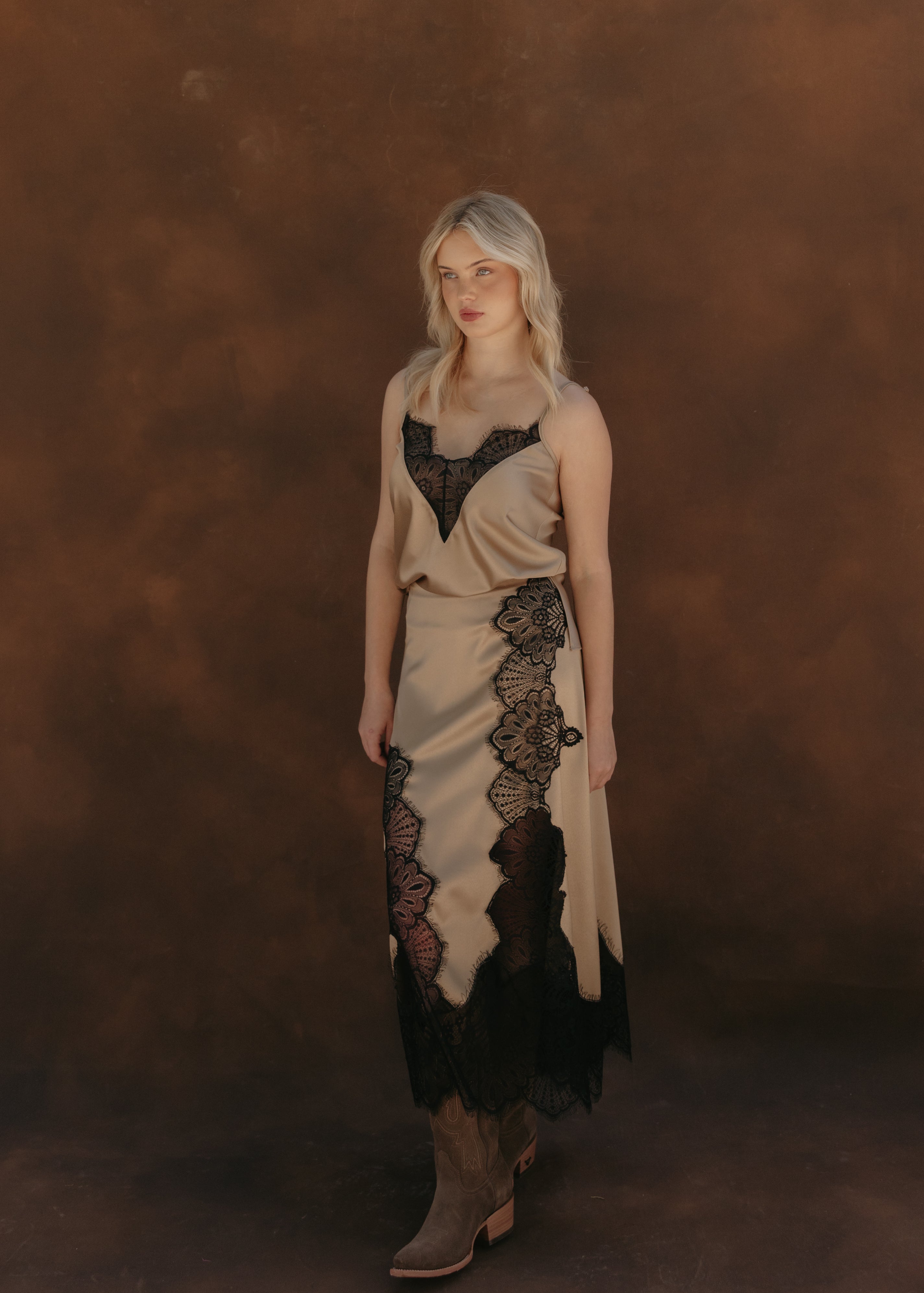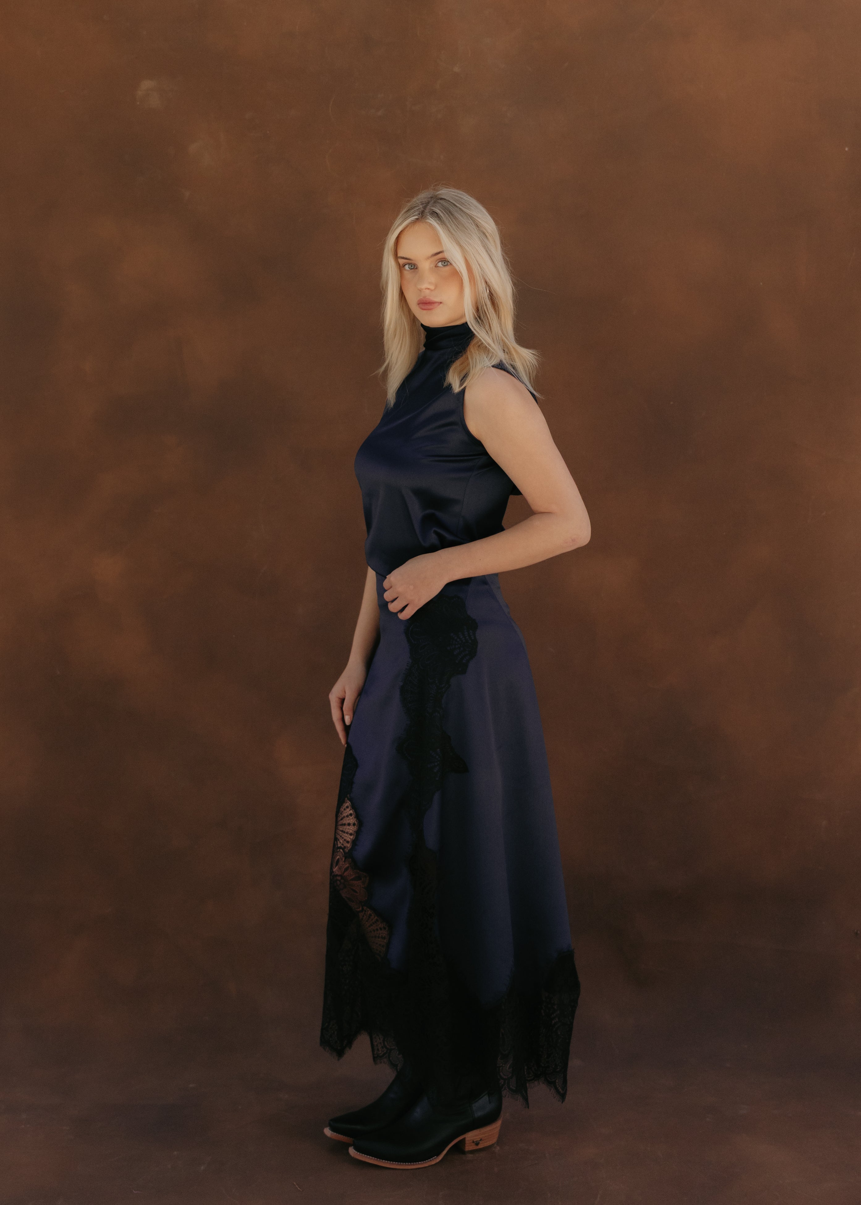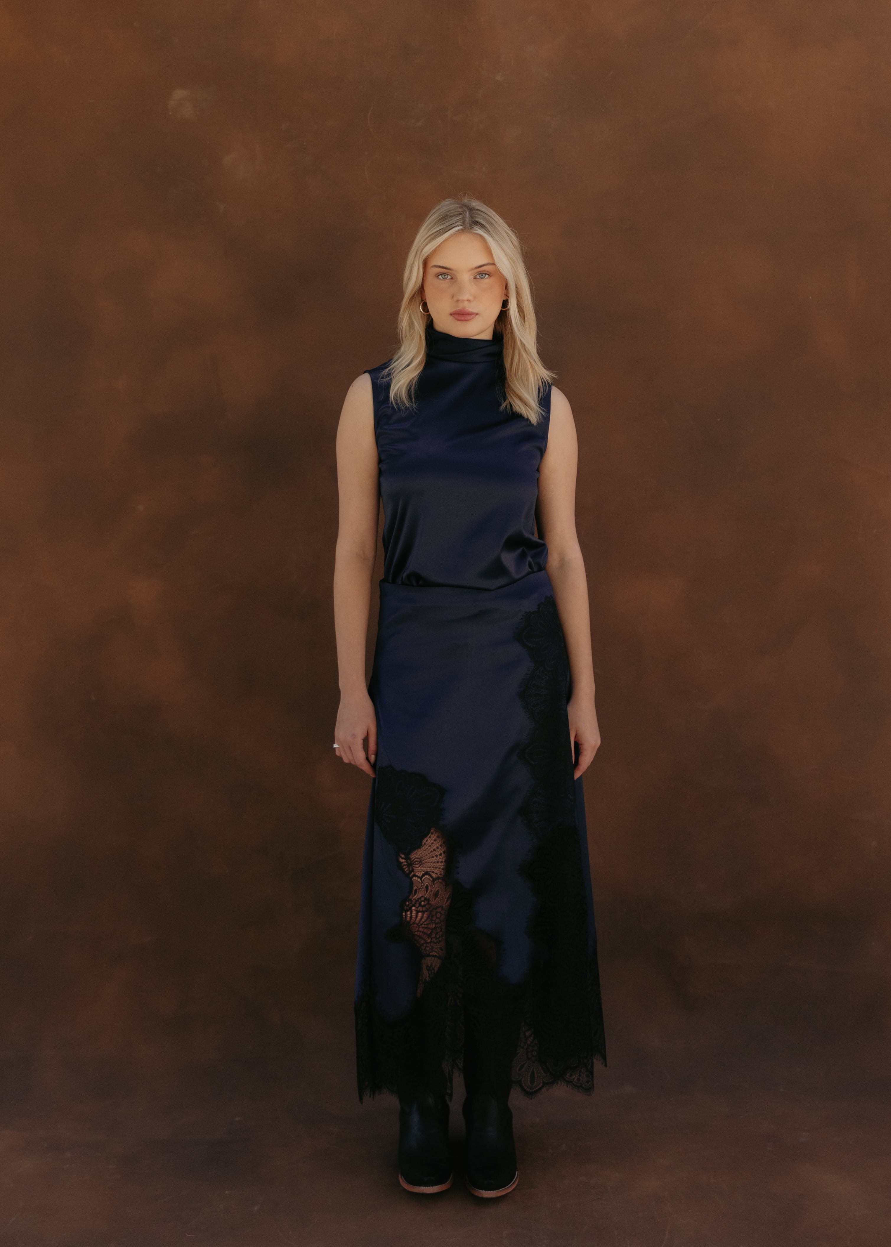 Falda midi confeccionada en raso con aplicaciones de encaje en los costados, el frente y la parte trasera. Cuenta con ajuste en la cintura mediante cierre. Su combinación de texturas crea una silueta femenina y refinada, ideal para elevar cualquier look con elegancia.