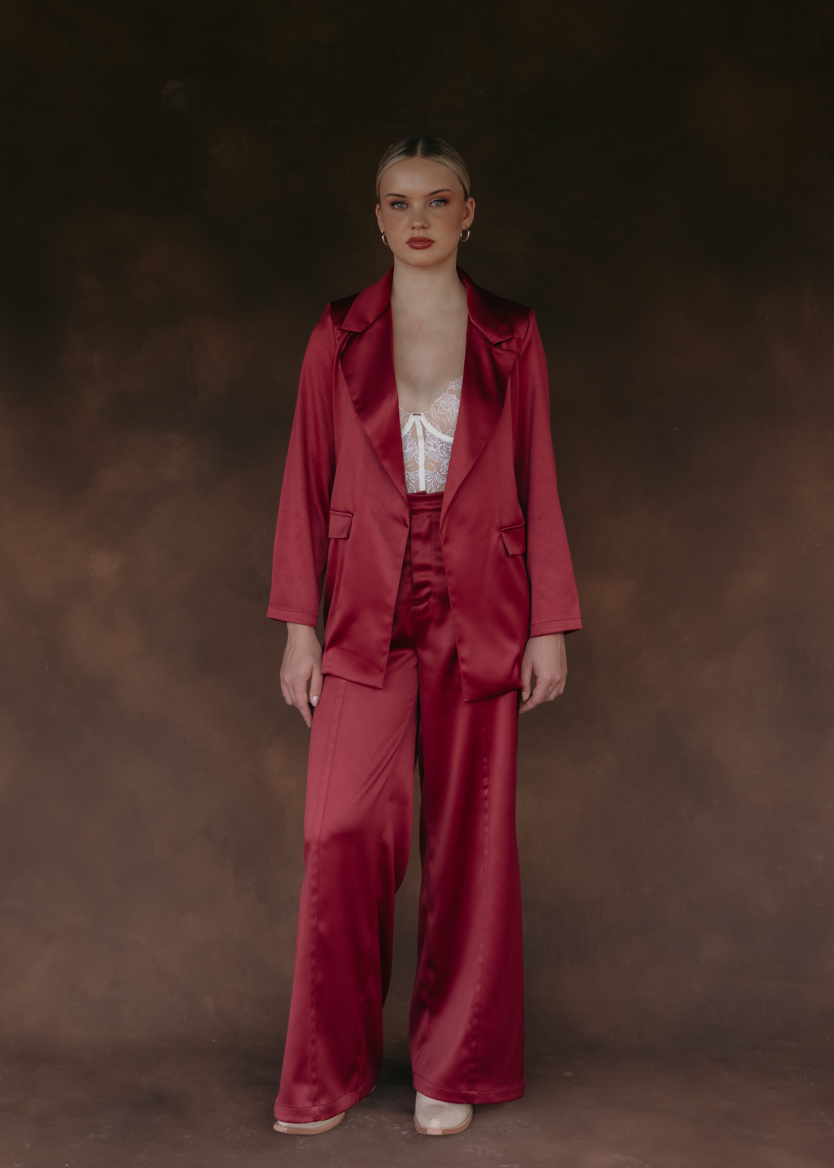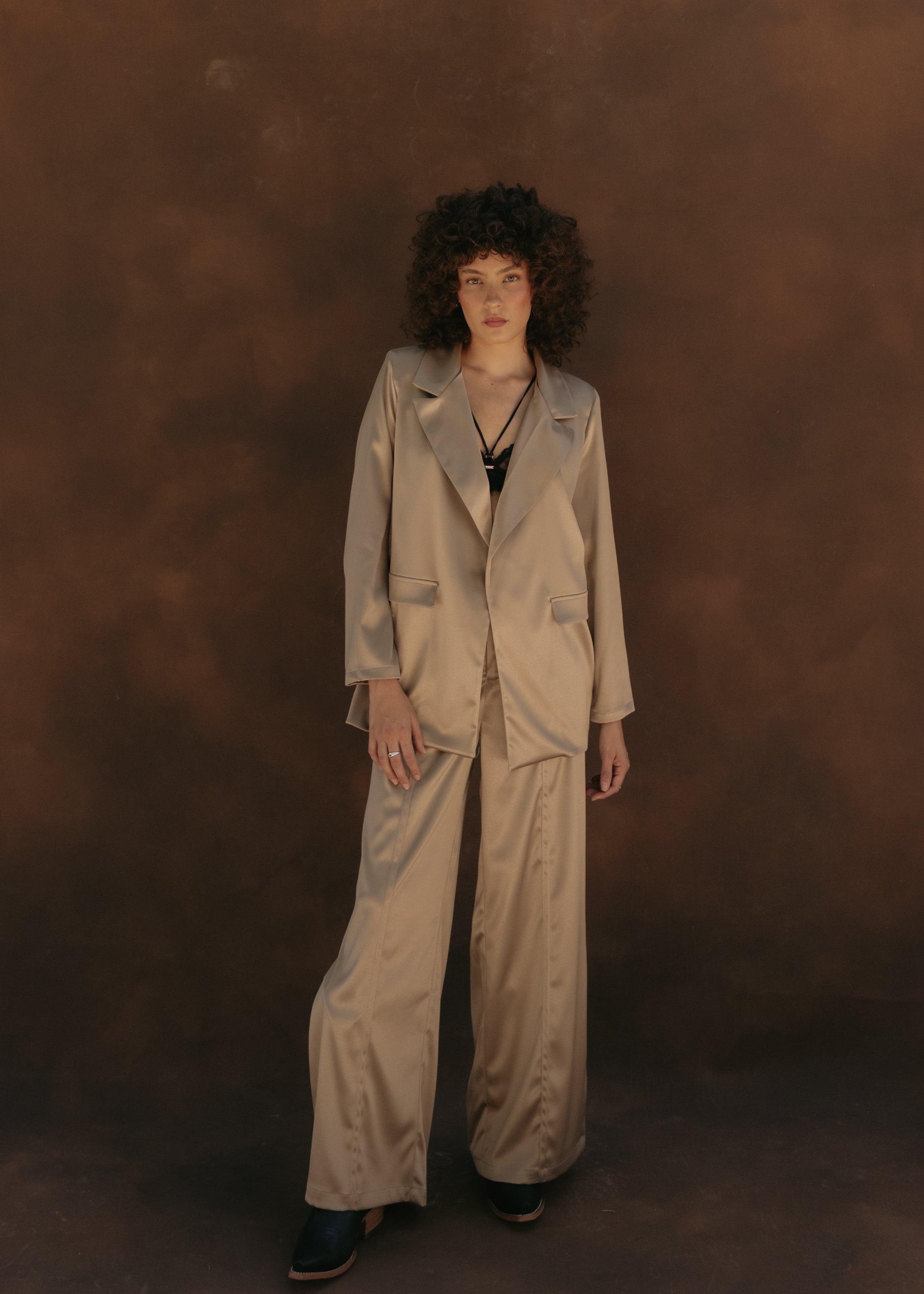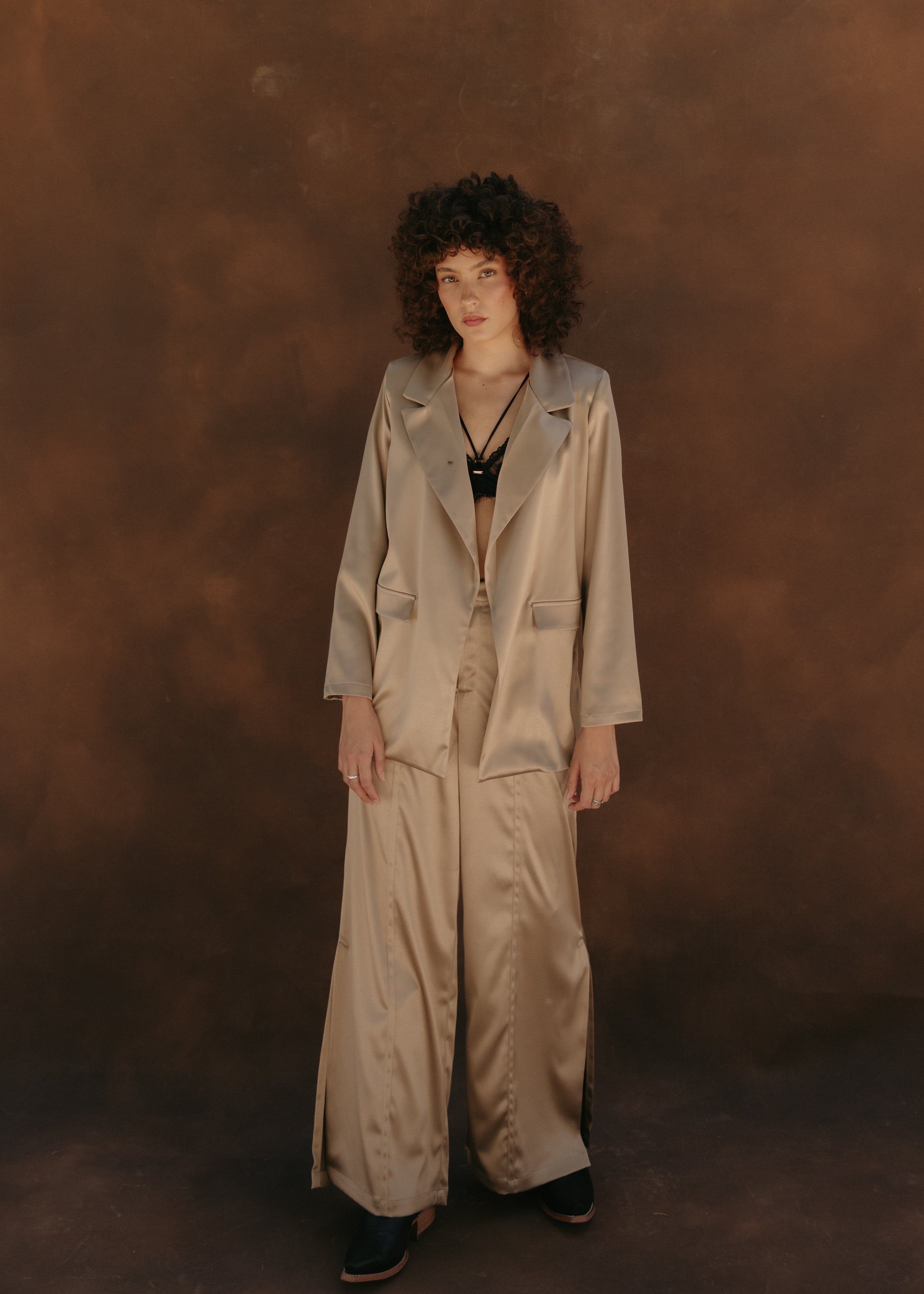 Saco de vestir confeccionado en raso, con hombreras y acabado liso. No cuenta con cierre y presenta una abertura cruzada en la espalda que aporta un toque juvenil y casual. Ideal para elevar cualquier conjunto con una silueta moderna y ligera.