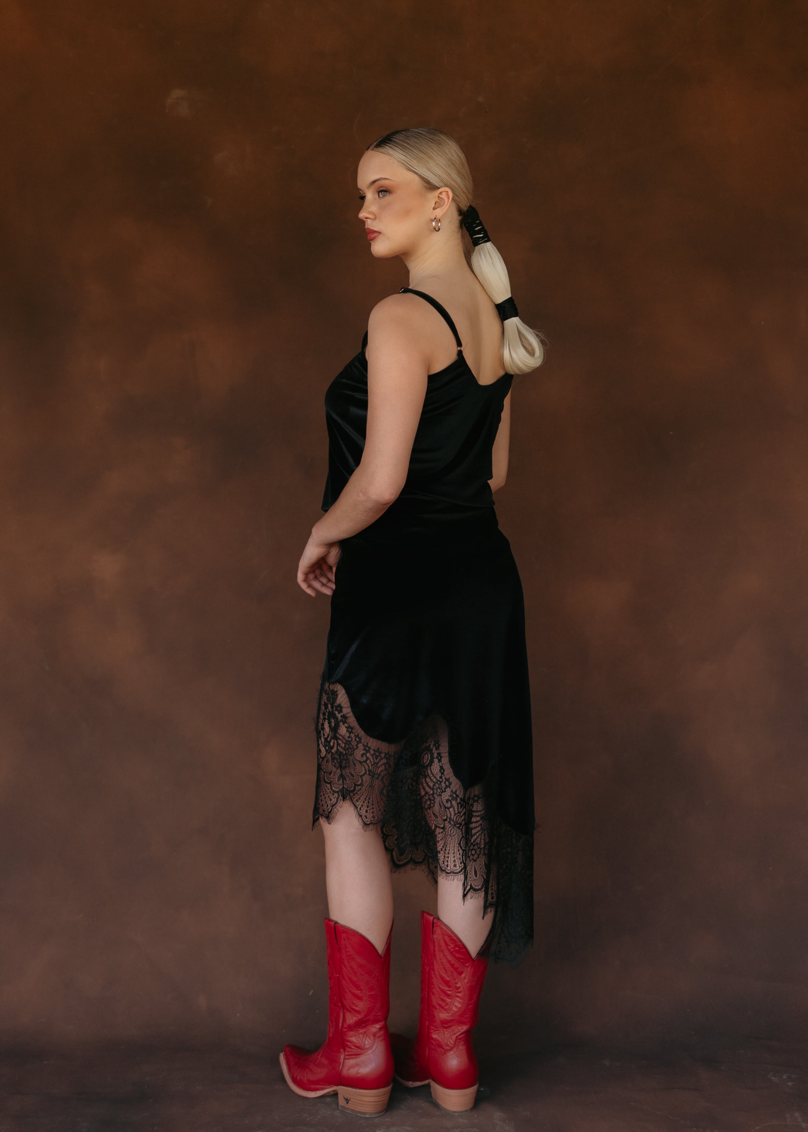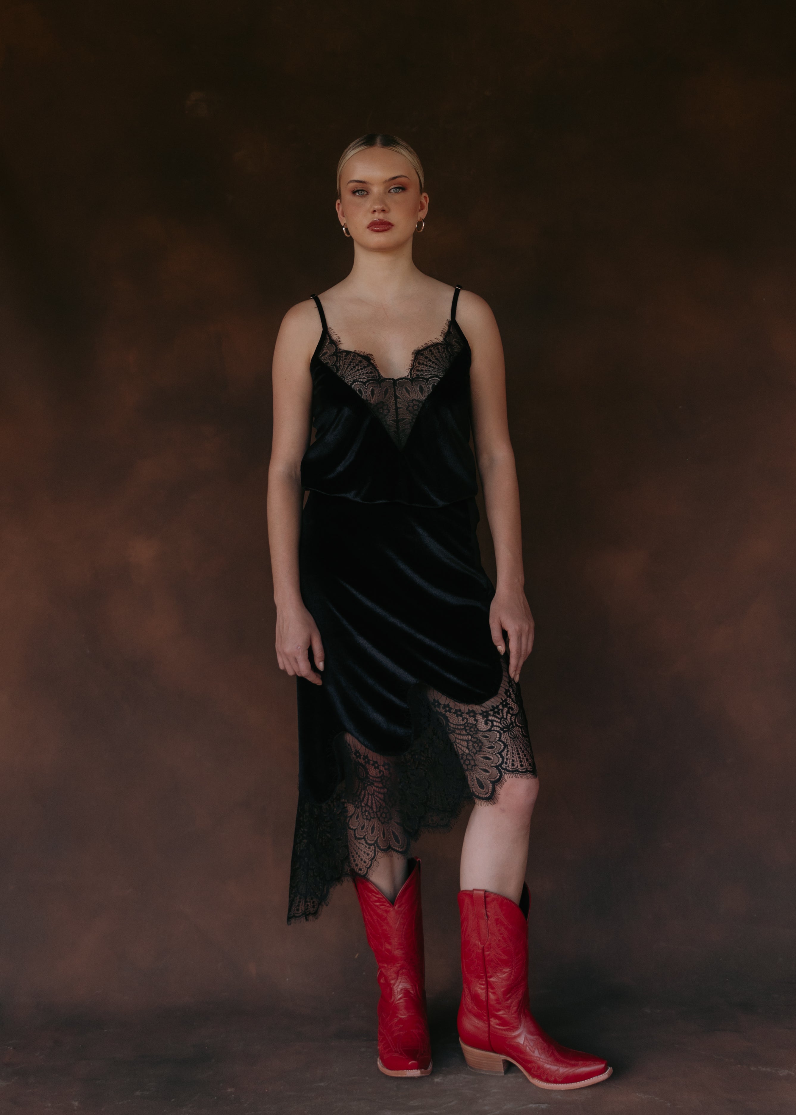 Top de raso con escote en “V” adornado con aplicación de encaje. Presenta aberturas laterales que aportan movimiento y ligereza. Su diseño equilibrado entre sensualidad y sutileza lo hace ideal para cualquier ocasión especial.