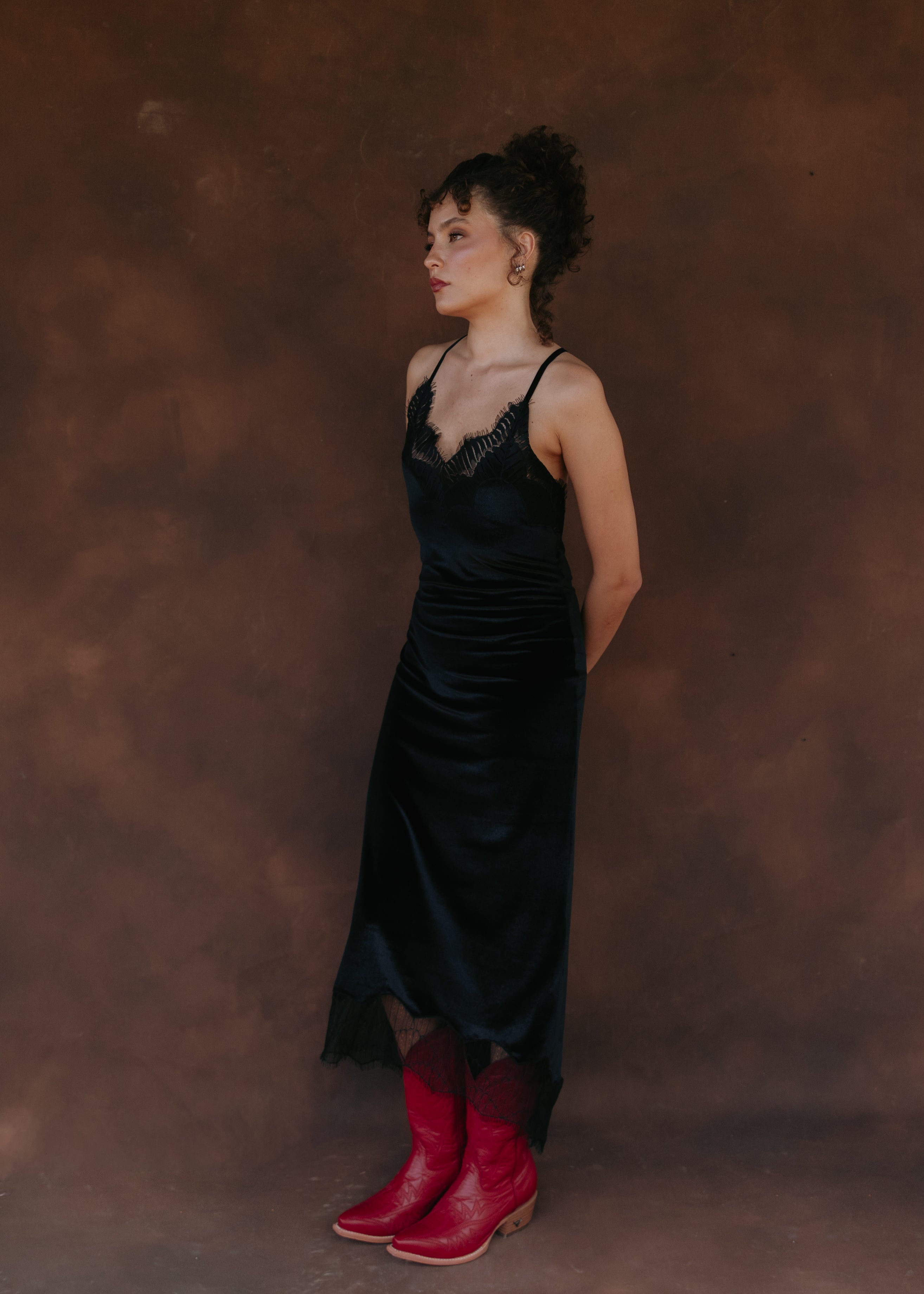 Vestido midi de raso con tirantes ajustables y aplicaciones de encaje en el escote frontal y trasero, así como en el ruedo. Su confección resalta la silueta con delicadeza y un brillo sutil. Una prenda romántica y atemporal con detalles de encaje que elevan su feminidad.