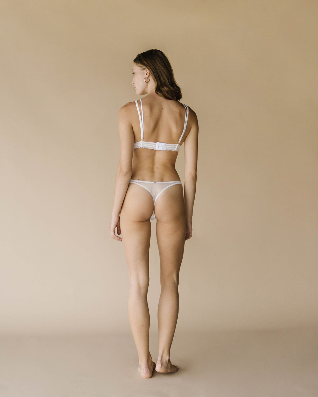 La tanga "Lya" está confeccionada completamente en mesh elástico lo cual la hace muy cómoda. Presenta detalles delicados de encaje en la parte delantera, añadiendo un toque de elegancia a su diseño. Combínalo perfectamente con el bra "Lya" para un conjunto coordinado.