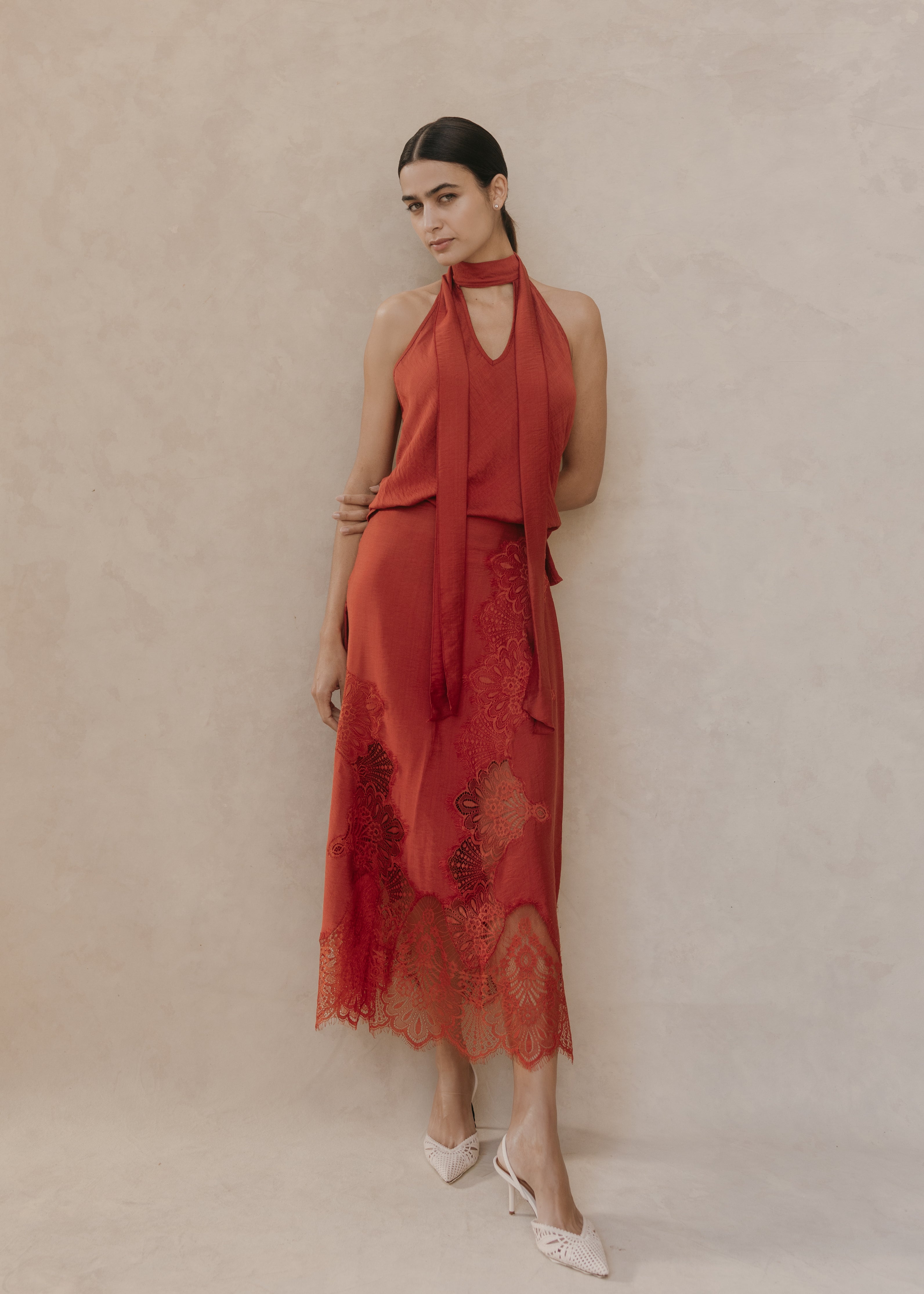 Falda midi confeccionada en lino en tono ivory, con aplicaciones de encaje en los costados, el frente y la parte trasera. Cuenta con ajuste en la cintura mediante cierre. Su combinación de texturas crea una silueta femenina y refinada, ideal para elevar cualquier look con elegancia natural y sofisticación atemporal.