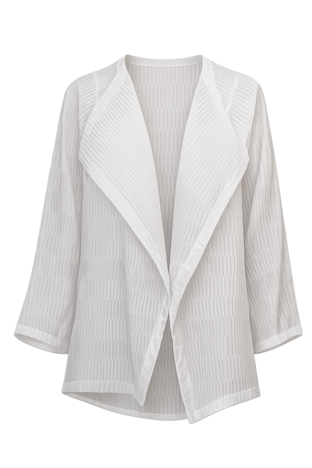 Kimono elegante para mujer en tono ivory, con textura plisada en relieve que crea un efecto tridimensional y movimiento sofisticado. Ligero, versátil y fácil de combinar, es la pieza ideal para layering: úsalo sobre tops o pantalones para elevar cualquier outfit. Su acabado arquitectónico aporta profundidad visual sin peso, logrando una silueta fluida y contemporánea.
