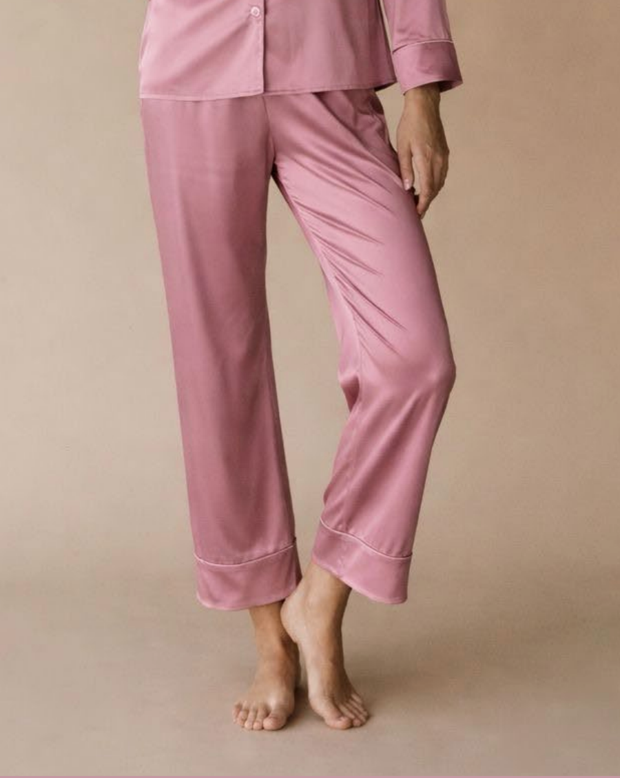 Los "Pantalones Chambre" con corte recto confeccionados con satín elástico con un detalle de color en el bies, diseñados sin bolsillos para un aspecto minimalista, reflejan comodidad y elegancia. Los "Pantalones Chambre" completan el conjunto de pijama en combinación con la "Blusa Chambre".